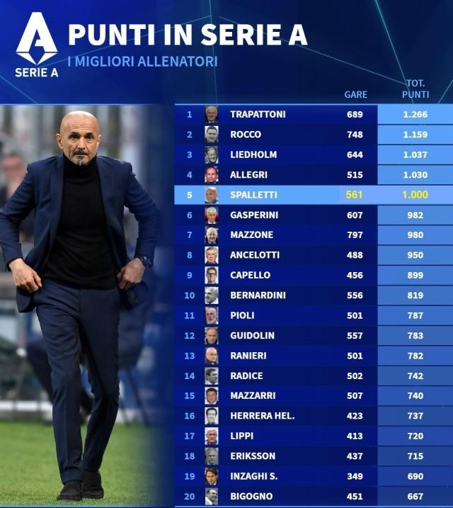 尤文0比0都靈,憑借這場平局,斯帕萊蒂拿到執教生涯意甲第1000分,成為特拉帕托尼、羅科、利德霍爾姆和阿萊格裡之後,第5位在意甲中達到 1000 分裡程碑的教練(勝場按3分計算,對手棄權算勝)。 在這561場意甲比賽中,斯帕萊蒂先後帶領恩波利(34場37分)、桑普多利亞(28場34分)、威尼斯(17場15分)、烏迪內斯(117場178分)、羅馬(211場422分)、國際米蘭(76場141分)、那不勒斯(76場169分)和尤文圖斯(2場4分),取得瞭289勝133平139負的戰績。